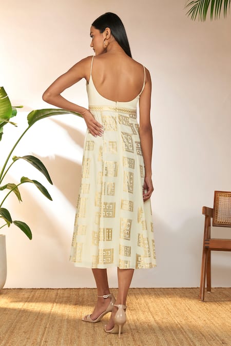 Ivory Crepe, Silk Foil Printing Scoop Neck Open Door Backless Dress