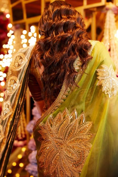 Green saree adorned with Paan Patti motifs in gota patti embellishment. Paired with a matching unstitched blouse piece and a bottle green dupatta featuring Neel Kamal embroidery and embellished borders.