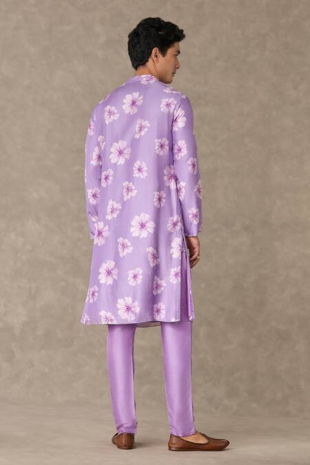 Lilac kurta featuring floral prints with dori, sitara & dabka embroidery on the yoke. Paired with straight pants that have pockets.