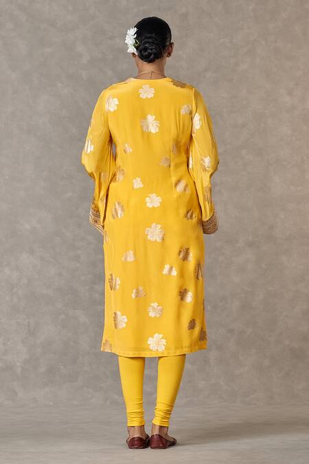 Yellow Crepe, Silk Sequins, Zari V-neck Parijat Print Kurta