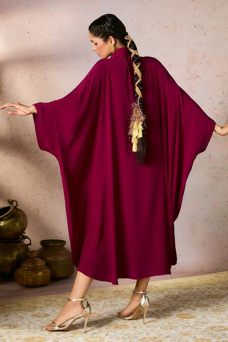 Wine Crepe, Silk Foil Printing Collared Placed Kaftan