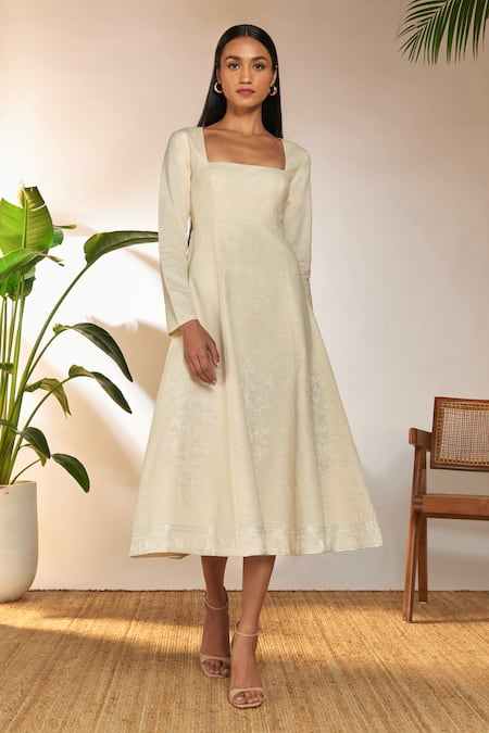 Ivory Cotton, Linen Embroidery Square Neck Pomegranate Dress
