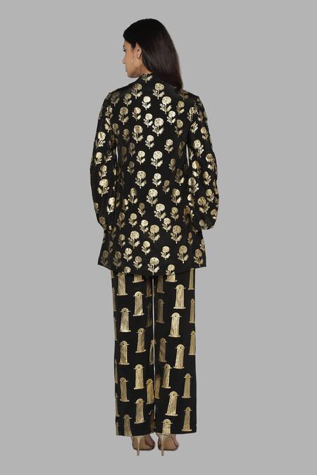 Black short tunic with marigold foil printed motifs & flared sleeves. Paired with blooming pillar foil print motif pant.