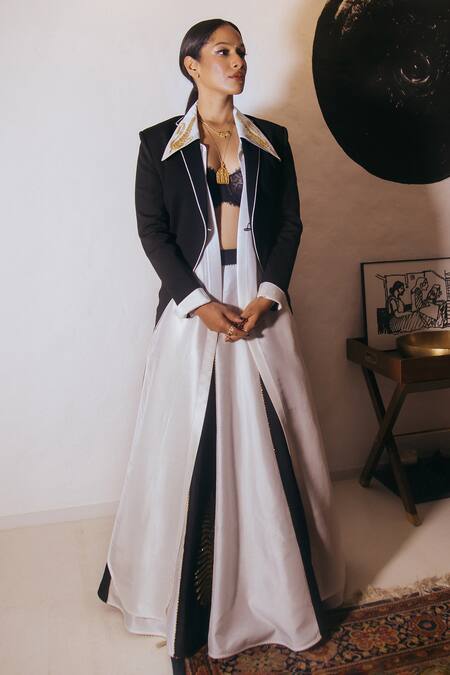 Black tailcoat blazer with gold dori work and intricate sequin detailing at the back. Comes with an ivory longline silk shirt with a statement collar embellished with zari embroidered motif, inspired from the crop motif engraved on the Indian rupee coin. Paired with a delicate black lace bustier and a lehenga, embroidered with Kashmiri leaf motifs in gold zari with sequin detailing, accompanied with a separate can-can skirt.