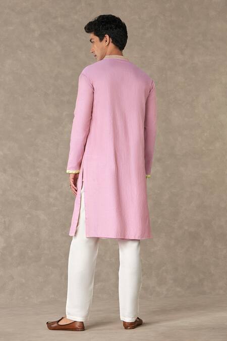 Pink kurta featuring long sleeves and a mandarin collar with bloom sequin embroidery on the placket