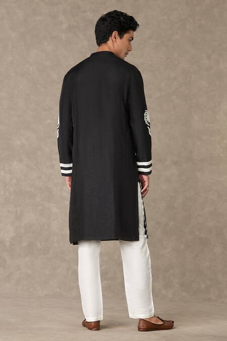 Black kurta featuring palm tree embroidery in dori and sequin work, with a concealed placket and pocket detail. Paired with ivory straight pant made from raw silk.