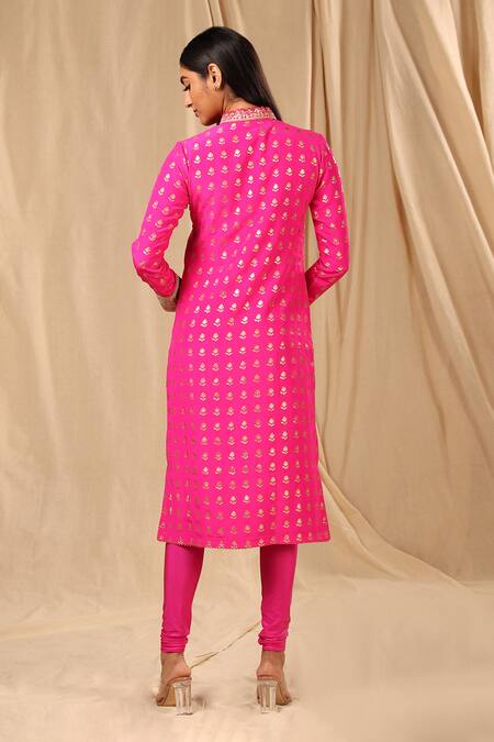 Hot pink kurta with wallflower foil print & placement embroidery.