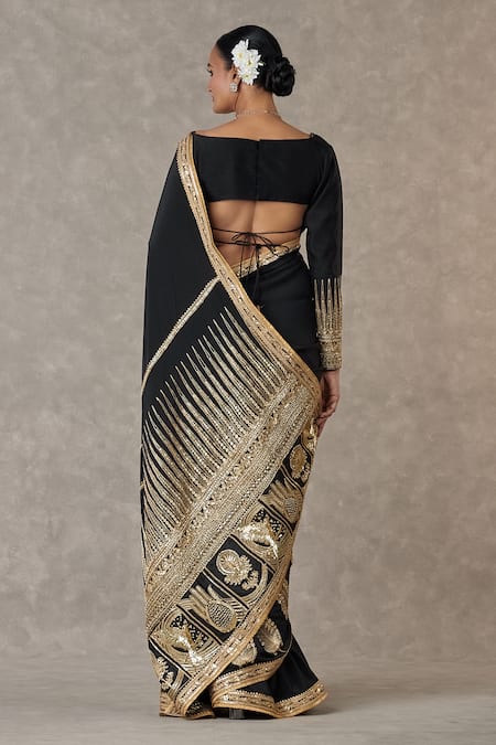 Black crepe silk saree featuring son patti, son chidiya & trikone embellishments using dori and sitara work. Comes with an unstitched trikone embroidered blouse piece.