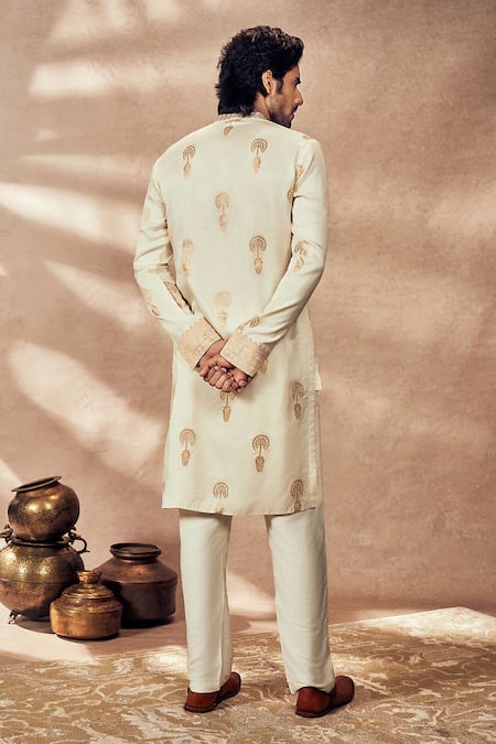Ivory jacquard silk kurta featuring intricate thread embroidery details