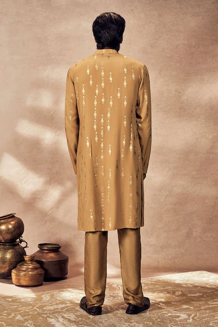 Beige kurta featuring full sleeves, mandarin collar, and tribal pillar foil print