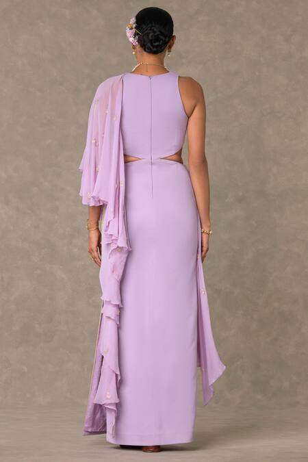 Purple saree gown featuring a plunged V neck and sleeveless design