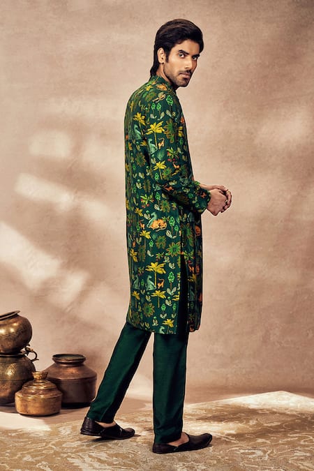 Green Silk Tropical Print Kurta