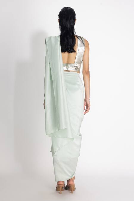 Mint pre-draped saree crafted from silk and cotton, featuring a square open back blouse. The ensemble includes a blouse adorned with sequin coin embellishments and snap buttons on the pallu.