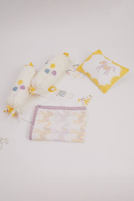 Yellow hypoallergenic cotton cot sheet with all over circus motifs hand block print. Comes with a horse, scalloped print pillow cover with flange edges, horse print dohar blanket & two bolster covers.