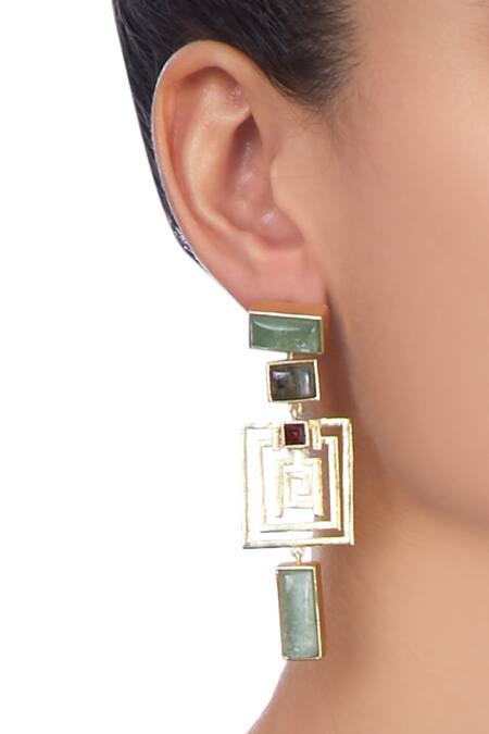 Gold plated geometric motif earrings featuring a maze base and square shaped green and black stones