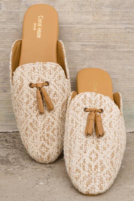Beige jacquard mules featuring a faux leather design and a tan cushioned sole