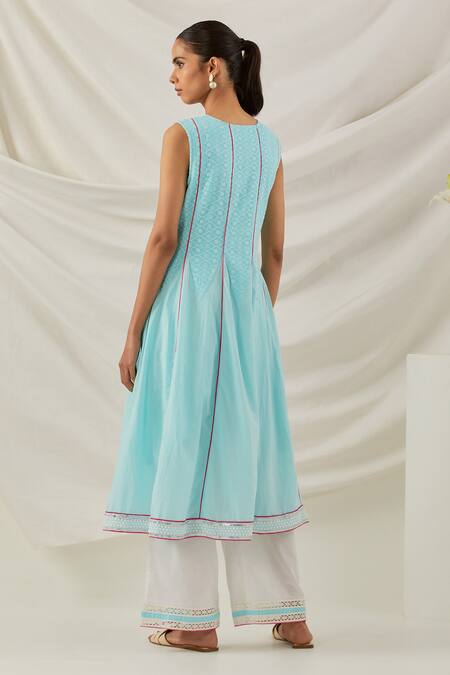 Blue kurta featuring chikankari embroidery on the bodice. Paired with palazzo and dupatta, it includes side slit pockets and pink piping details.