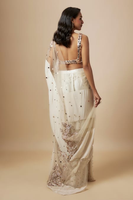 Beige pre-draped saree featuring hand embroidered sequins and floral patterns. Paired with an open back sequin embroidered blouse.