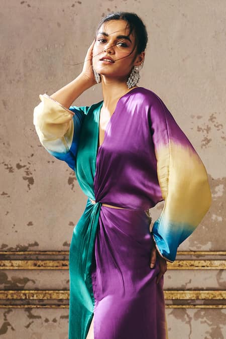 Purple, beige, and teal colorblock kaftan featuring a V-neckline and three-quarter sleeves