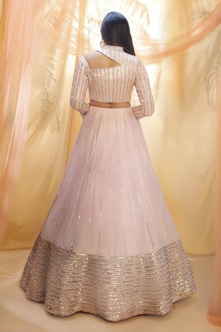 Lilac lehenga highlighted with embroidery. Comes with cutout blouse.