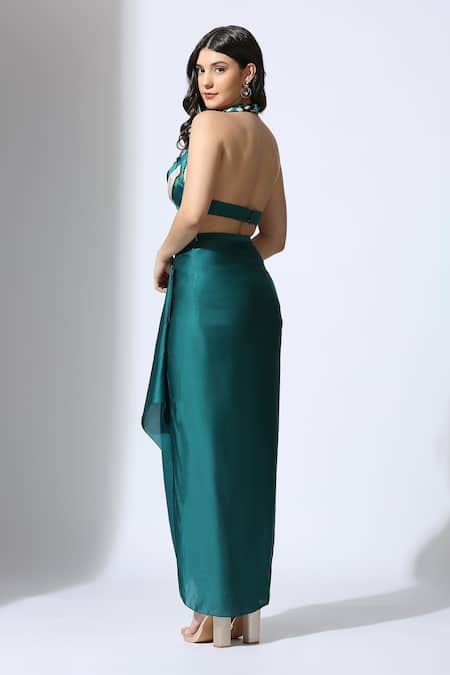 Teal green draped skirt featuring a pre-draped silhouette. Paired with a braided halter neck blouse in teal green and beige color block design.