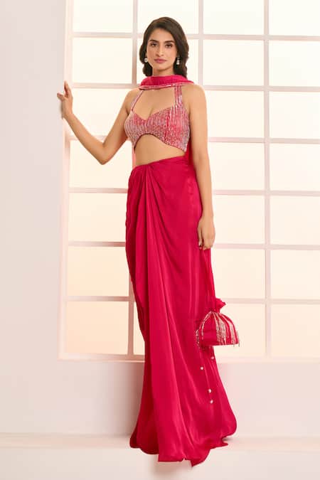 Hot pink sequin hand embroidered blouse with a plunging sweetheart neckline. Paired with a draped dhoti skirt and a coordinating scarf, along with a matching potli bag.
