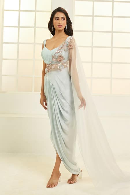 Blue draped dhoti skirt featuring floral vine embroidery and an attached sheer drape. Paired with a ruched padded blouse with back hooks.