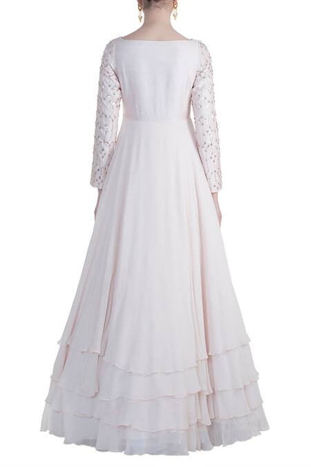 White Raw Silk, Crepe, Shantoon Boat Embroidered Layered Anarkali