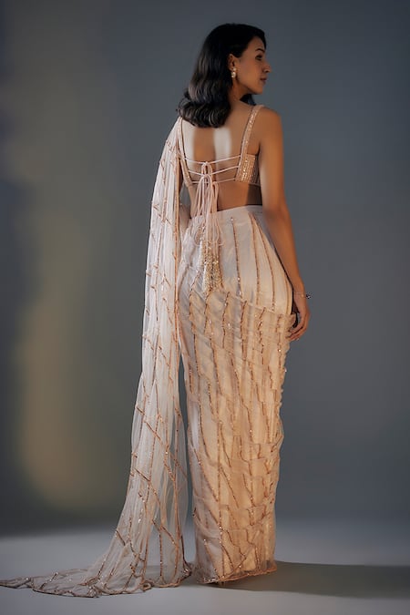 Rose pink pre-draped saree featuring hand embroidered linear patterns. Paired with a backless embroidered blouse with multi tie-up closures.