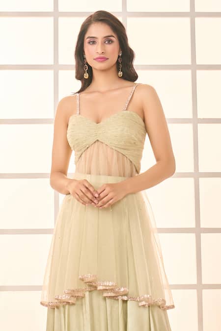 Sage green embroidered short anarkali featuring a ruched bodice and semi-sheer panels. Paired with a coordinating sharara, this ensemble is designed for comfort and elegance.