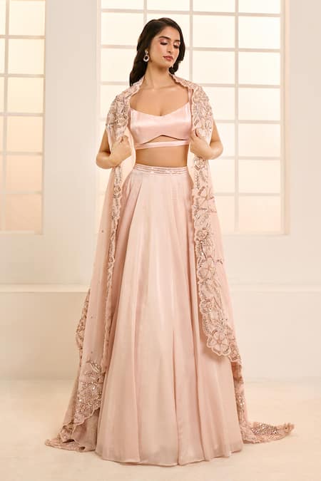 Rose gold lehenga set featuring a floral embroidered blouse and cape. The set includes a flowy lehenga with an asymmetric hem and attached lining.