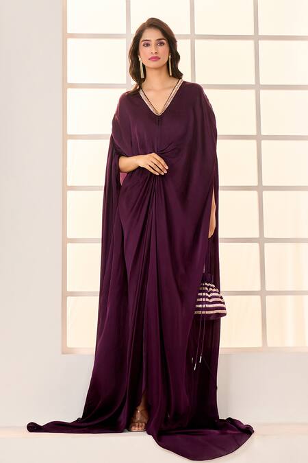 Wine satin organza kaftan featuring a front twisted detail and intricate pleated draped details. Paired with an embroidered potli bag.