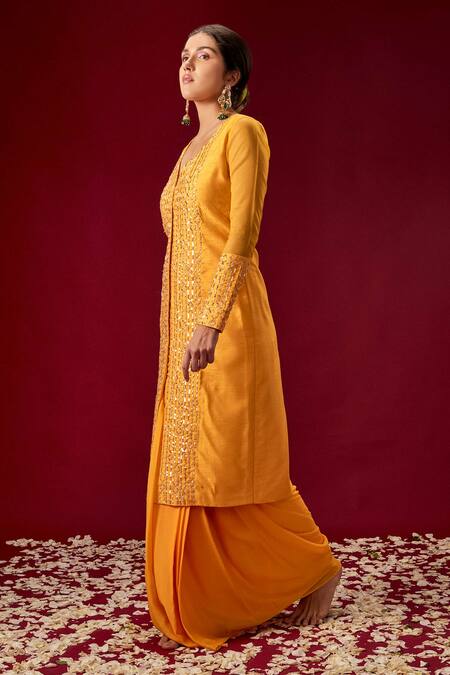 Yellow Crepe, Dupion Silk V Neck Jacket Kurta And Dhoti Skirt Set