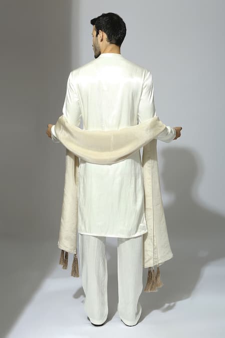 White silk kurta featuring contrast leaf pattern embroidery with a mandarin neckline. Paired with elasticated pant and fringed tassel hem creamish stole.