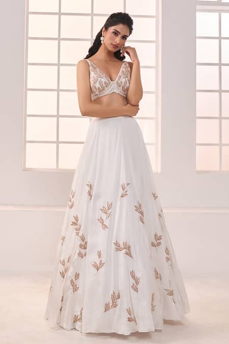 White lehenga featuring scattered leaf motifs embroidery with sequins. Paired with a matching embroidered padded blouse and dupatta.