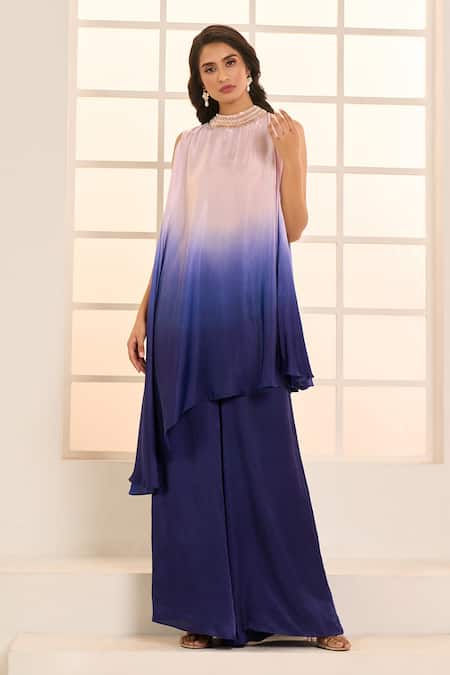 Purple ombre asymmetric kurta featuring a high neck and hand embroidery. Paired with matching flared pants for a complete look.