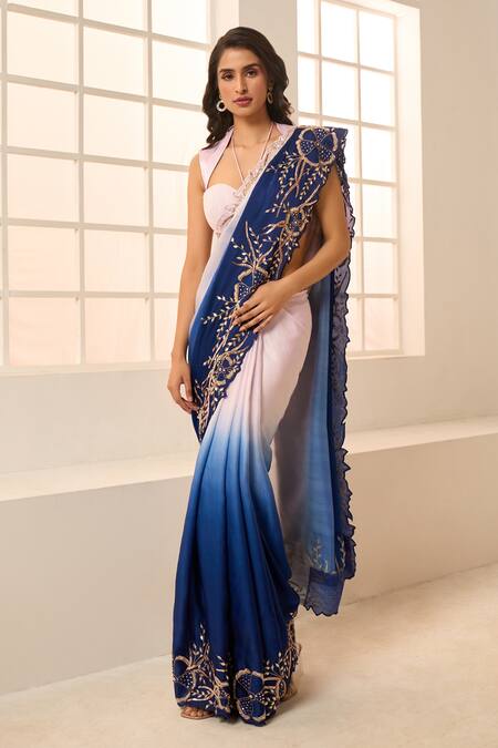 Floral vine embroidery along the saree border, Ruched padded blouse with noodle straps, Ombre color transition from lilac to navy blue