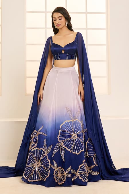 Ombre floral embroidered lehenga featuring a lilac and navy blue gradient with sequins. Paired with a padded blouse with cape sleeves and back hook closure.