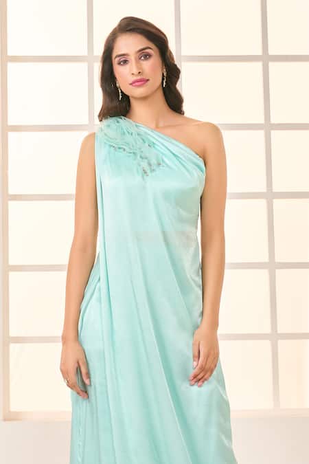 Green one shoulder kurta featuring tonal ruffle applique and bead & sequin work. Paired with flared pants for a complete look.