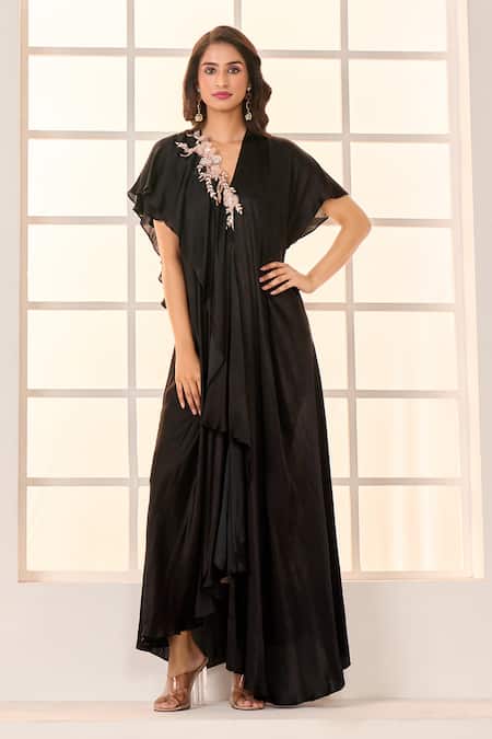 Black asymmetric layered kaftan featuring placement floral embroidery