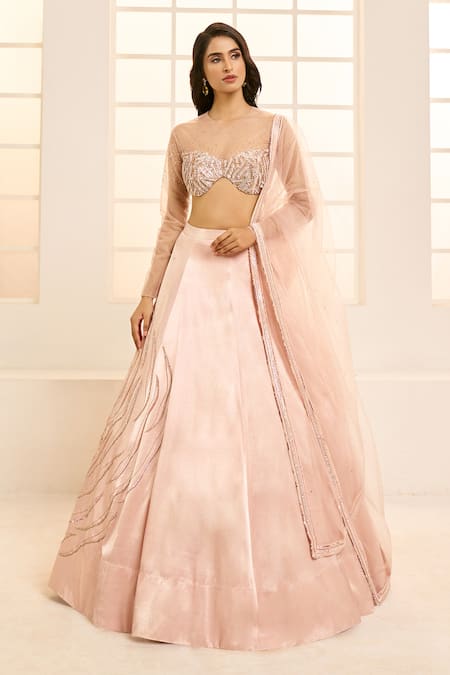 Rose Gold Net, Silk, Cotton Sequins, Beads, Placement Floral Lehenga Set