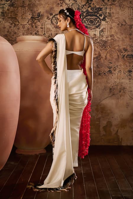 Rose gold pre-draped saree featuring a contrast fringed border. Accompanied by a blouse with layered fringes.