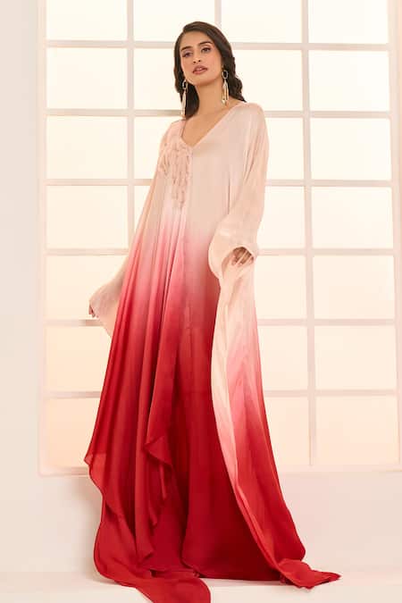 Rose gold and red front draped ombre kaftan featuring embroidered ruffle details on the yoke