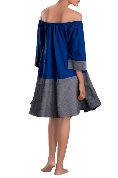 A blue off-shoulder short dress tailored in handloom cotton fabric. It features a grey patch along the hemline and cuffs. It has a relaxed fit.