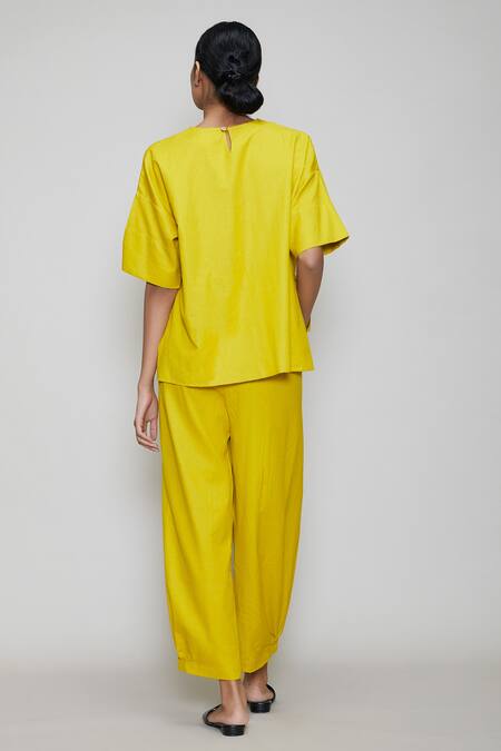 Yellow anti-fit top with round neck and high-low hem. Paired with pants.