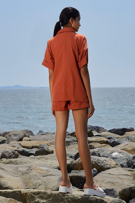 Rust half sleeve shirt featuring a collared neck and a front concealed placket. Paired with matching shorts that have an elasticated waistband and side pockets.