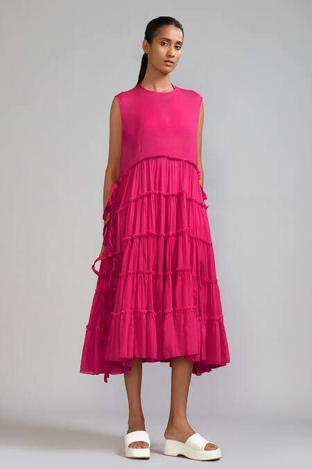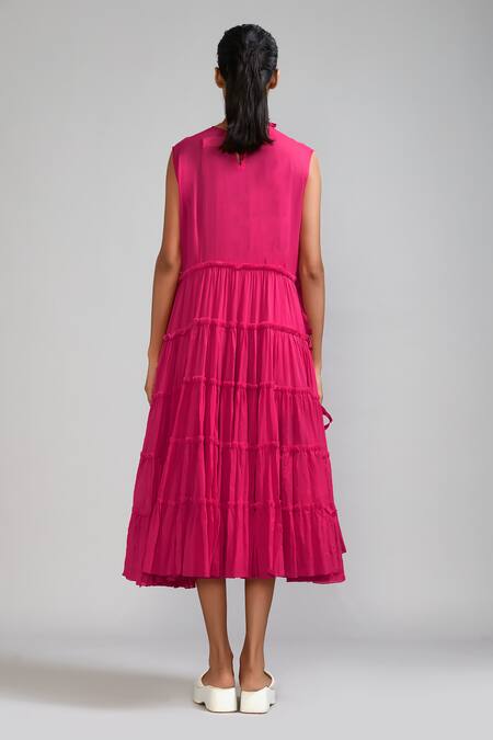 Pink tunic featuring layered fringe tassels with tiered panels and side tie-ups. Paired with matching shorts and a halter neck bralette.