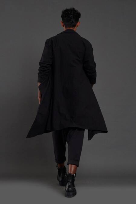 Black full sleeves hand woven front open draped jacket with co-ordinating t-shirt & drop crotch fit pant.