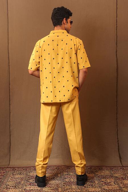 Mustard yellow handwoven cotton solid straight pant featuring attached side pockets
