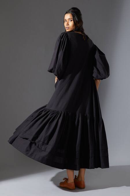 Black flared handwoven midi dress with pleated flounce hem, seam pocket & blouson sleeves.